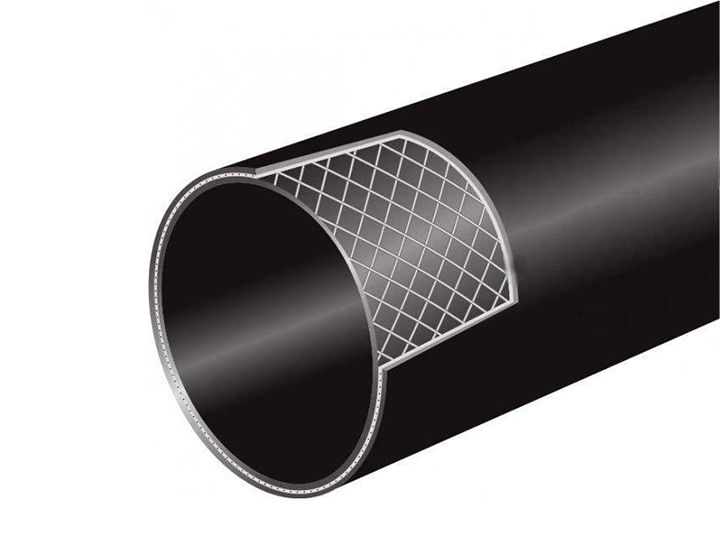 復合管是正、逆方向螺旋纏繞在管材中分布的高度鋼絲為增強骨架,以高密度聚乙烯為基本材料,利用高性能改性聚乙烯粘接樹脂,在生產線上通過連續、分次擠塑復合成型。管道連接采用電熱熔連接,連接強度與管體本身一致。